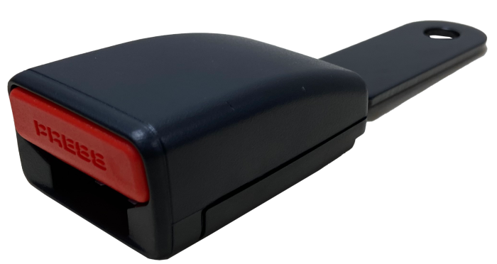 To fasten the harness, insert the metal tongue into the slot in the release buckle until an audible click is heard. To release, push the RED button.